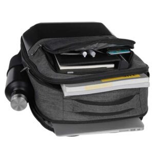 Luijan is a polyester laptop backpack with integrated external USB charging allowing the powerbank to be kept inside and the phone to be used outside. It offers sufficient space to store in your essentials & can easily fit a laptop of upto 15.6″. 2 main compartments , 2 side pockets, easy access compartment on the front & a quick access on the shoulder strap helps you store all your essentials in an organized manner. In addition, Luijan features a luggage strap at the back, so that it can be attached to any trolley, 2 side pockets and a card pocket on the shoulder strap for easy card access