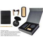 Gift set containing card wallet, bamboo pencil, recycled multicable set, and TWS earbuds.